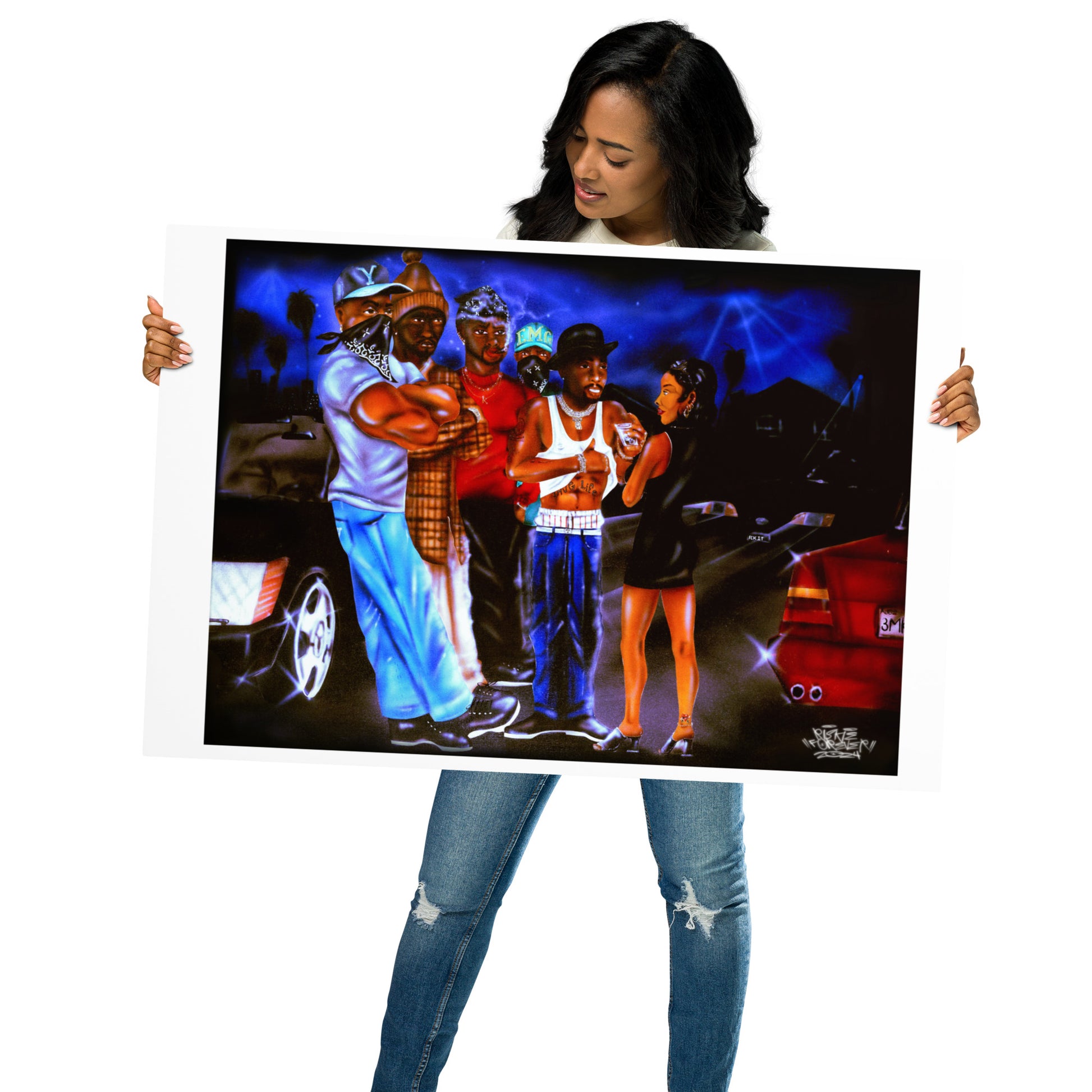 This iconic artwork, created by Riskie Forever and Hen Dogg in 1995, serves as an insert for 2Pac's legendary album *All Eyez on Me*. The piece captures the gritty, streetwise atmosphere that defined the West Coast hip-hop scene in the mid-'90s.