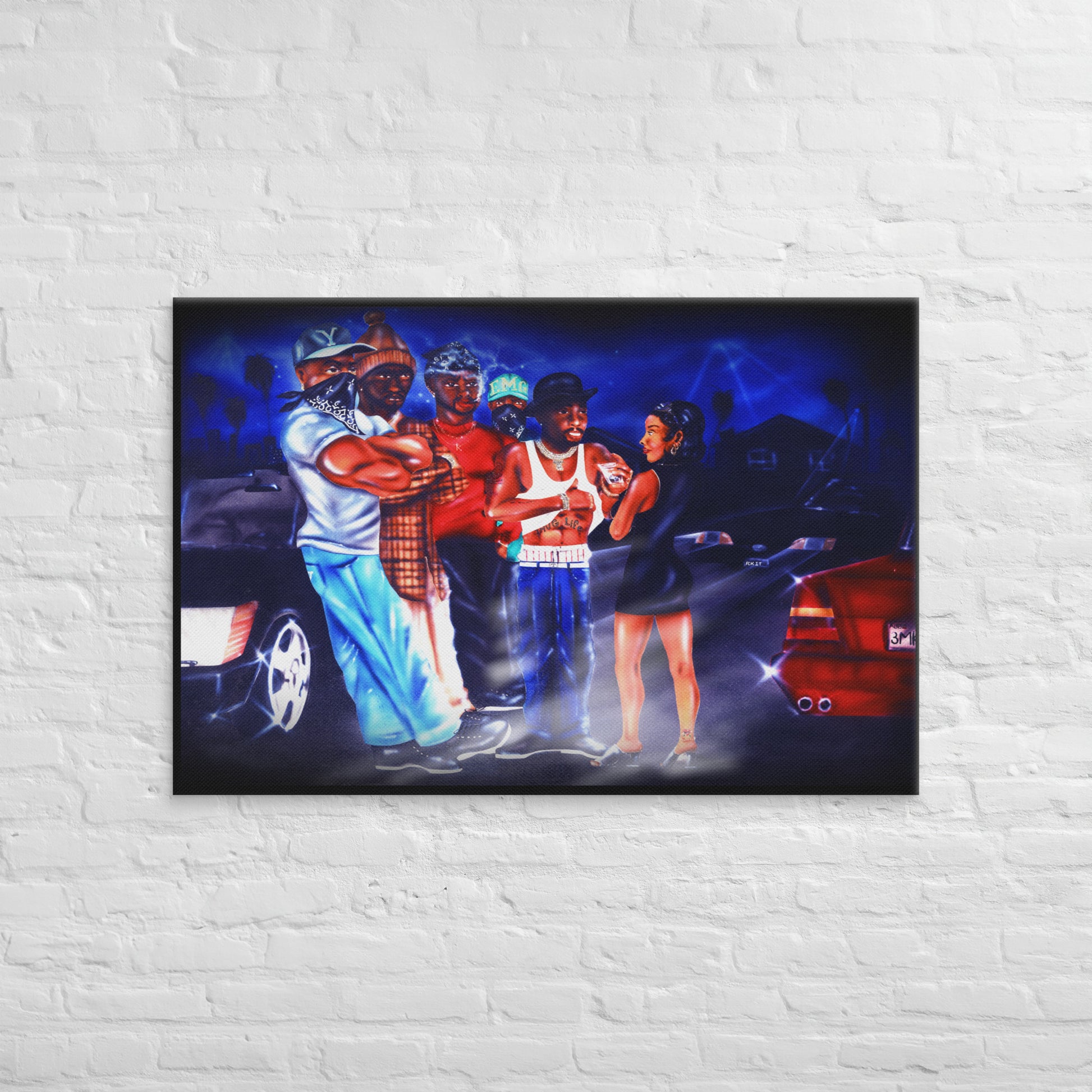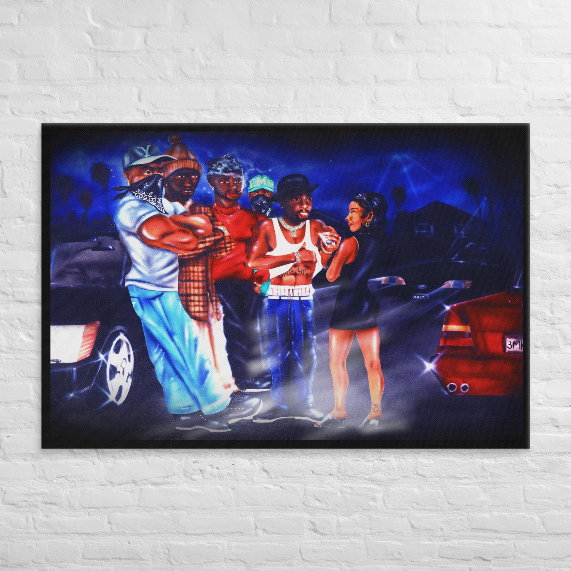 In the foreground, 2Pac is depicted with a defiant stance, his tattoos and bandana marking his allegiance to the streets. He's surrounded by a crew of imposing figures, each representing the hardened life of urban survival. The group is cast against a dark, moody night, with deep blues and blacks dominating the color palette, setting a tense, cinematic mood. A lone woman stands beside 2Pac, adding a layer of intrigue and street romance to the scene.