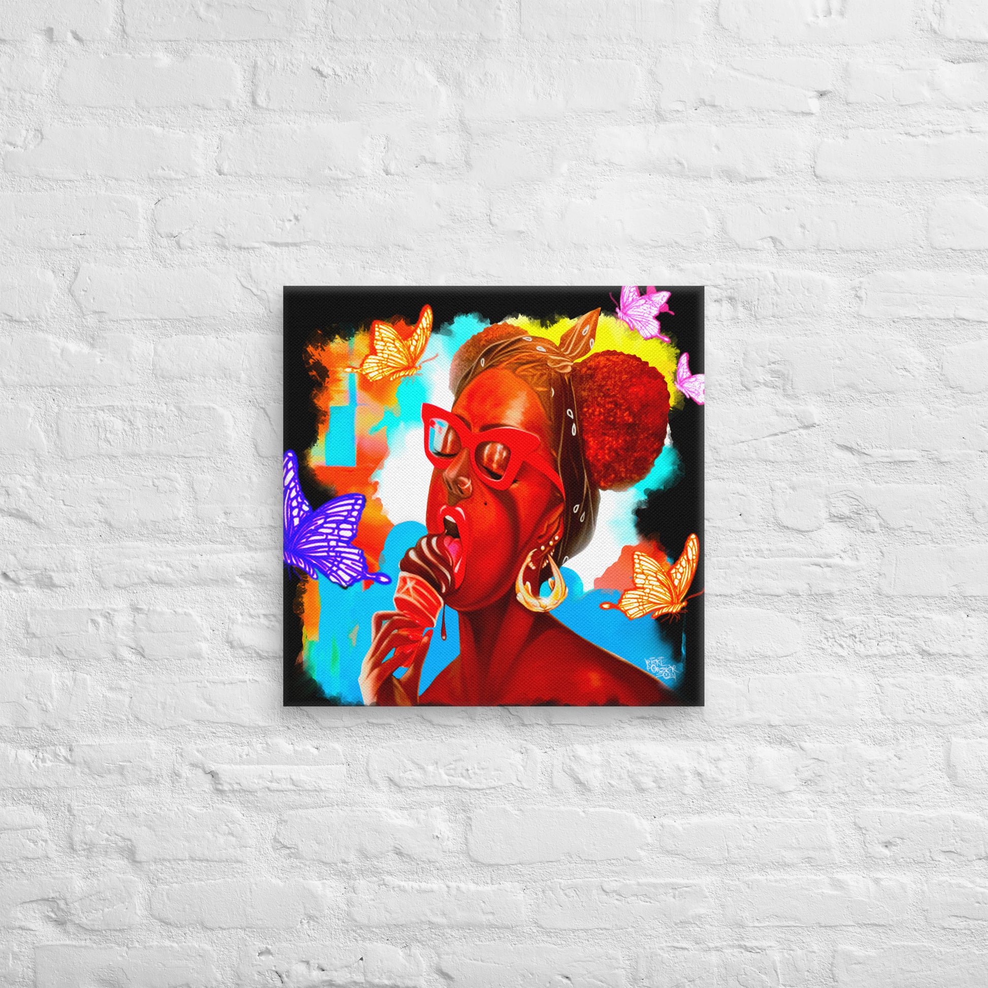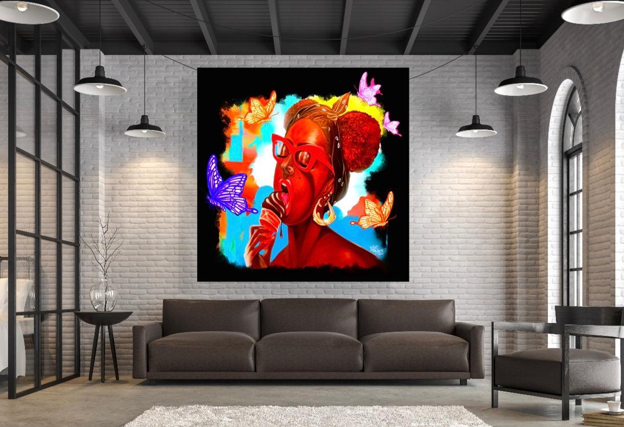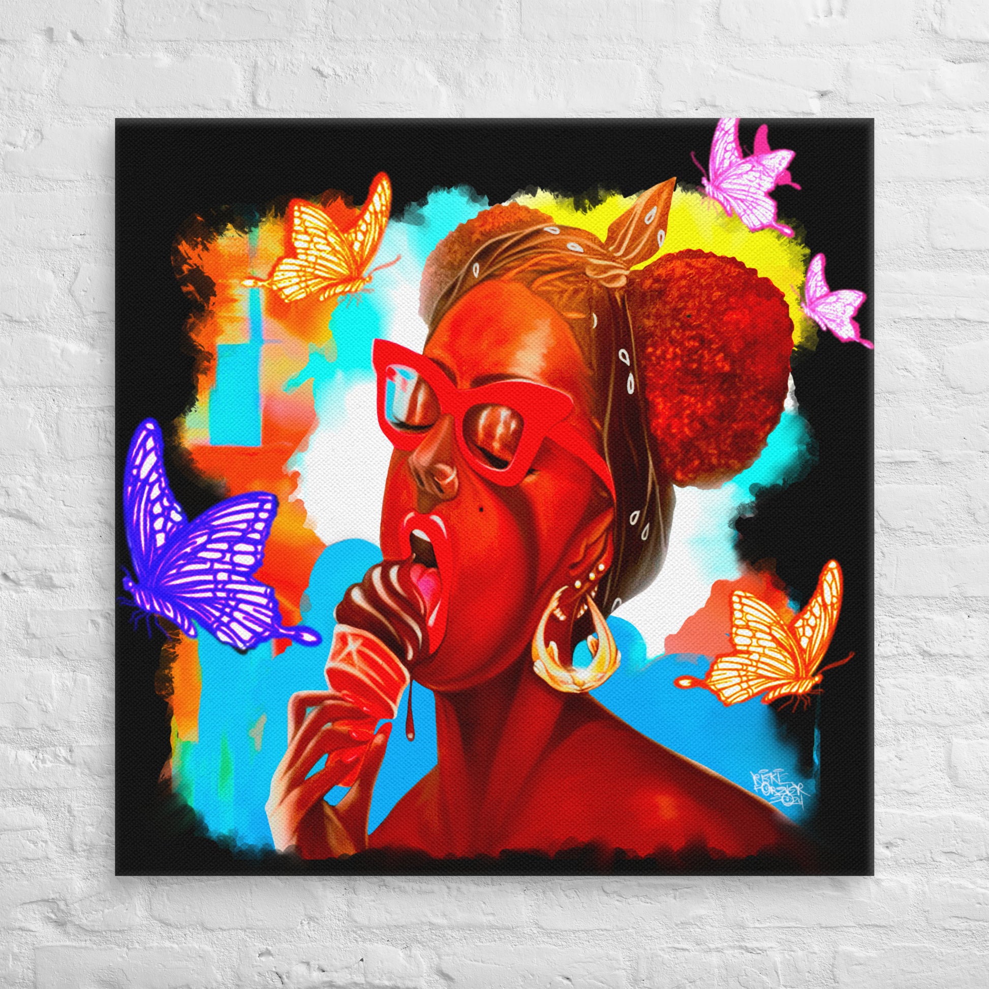 vividly captures the essence of a confident, stylish woman enjoying a chocolate ice cream cone. The central figure, with her rich, warm skin tone, is adorned with vibrant red glasses, large hoop earrings, and a headscarf that accentuates her natural hair. The cool, dripping chocolate contrasts beautifully with the bright, colorful backdrop. Surrounding her are fluttering butterflies in striking hues of blue, orange, and pink, adding a playful and lively element to the composition. The piece radiates a nostalgic, carefree vibe, reminiscent of LL Cool J's "Round the Way Girl," celebrating the beauty and spirit of everyday life.