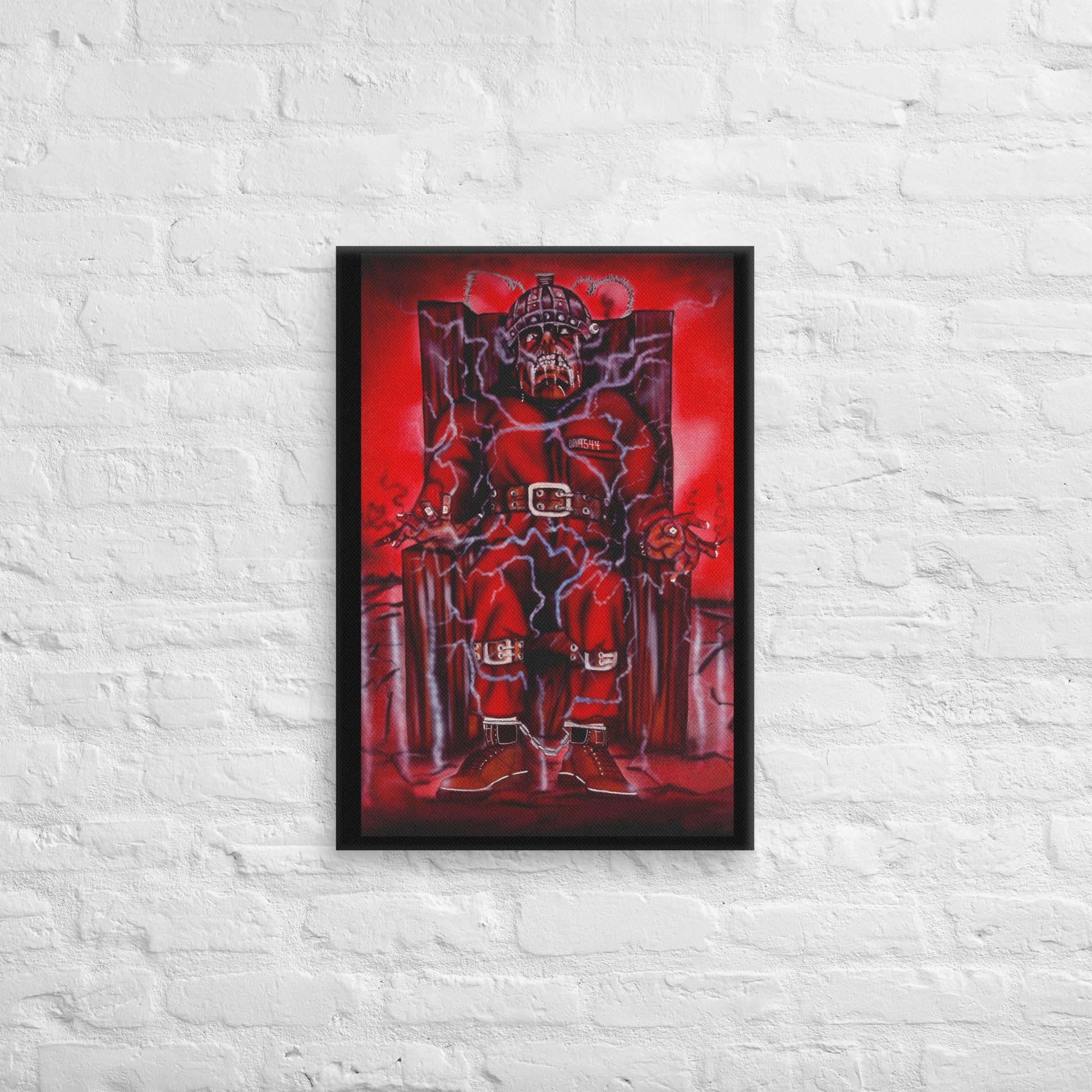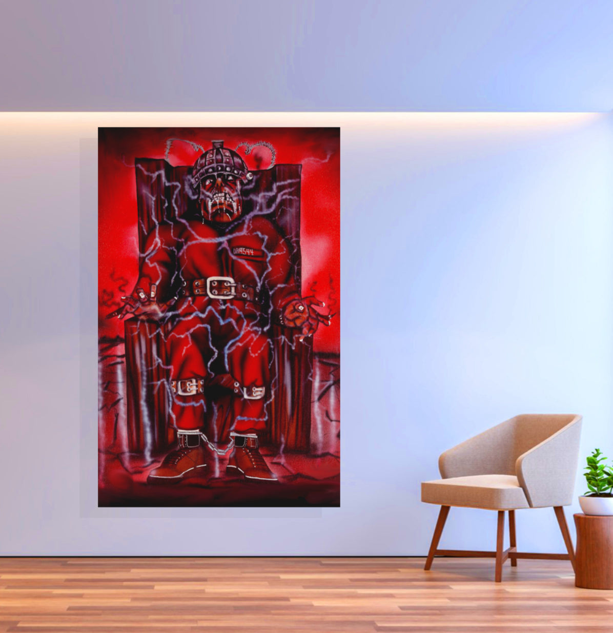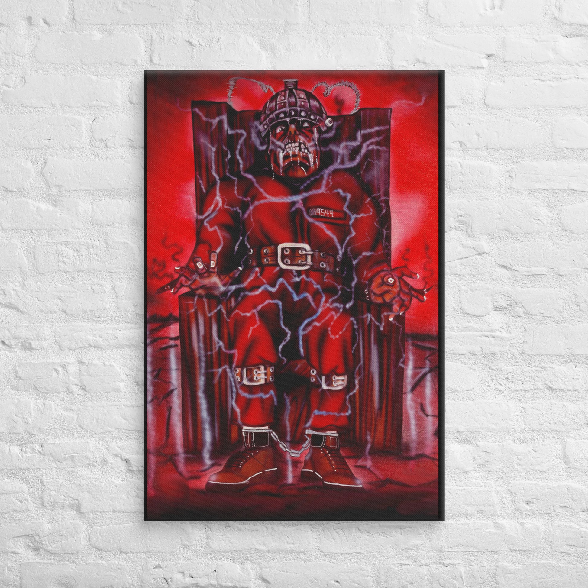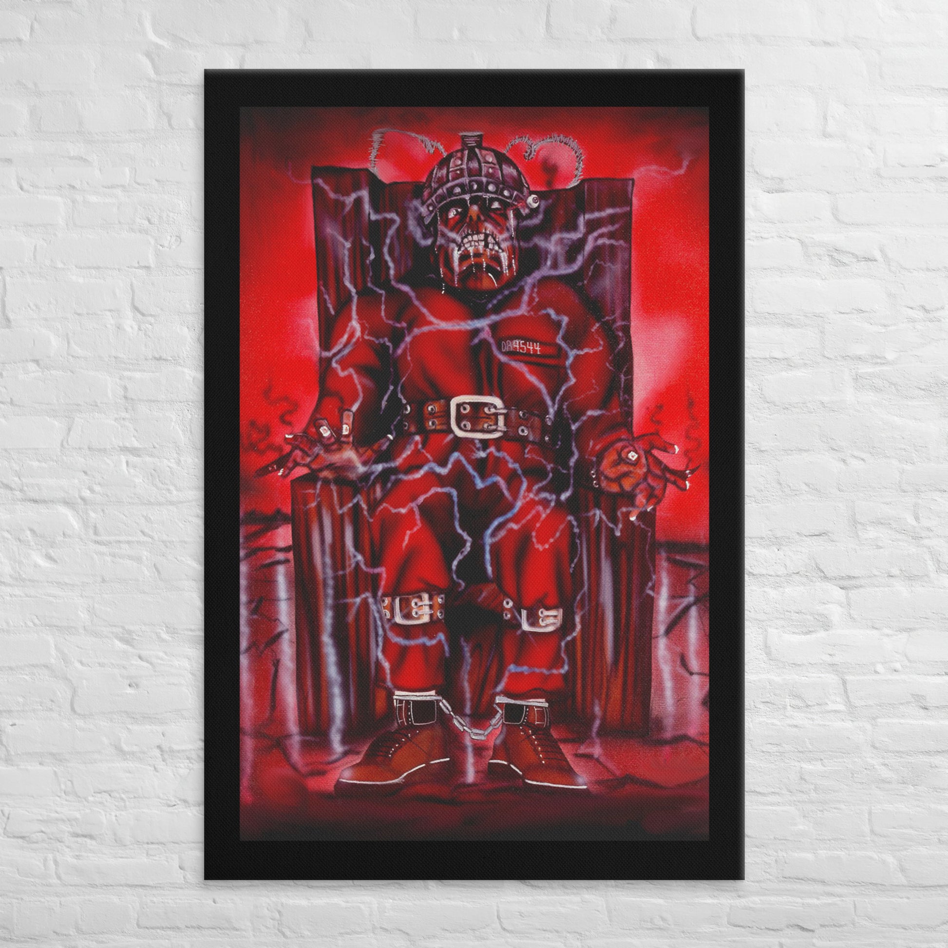 The painting depicts a haunting and intense image of a figure strapped into an electric chair, surrounded by bolts of electricity that seem to charge the air with palpable tension. The red tones throughout the piece evoke a sense of danger, power, and impending doom. The figure, dressed in a red prison jumpsuit with shackles and restraints, has a menacing and tortured appearance, blending elements of realism with surreal, almost demonic features. The twisted expression and skeletal face further emphasize the dark themes that often surrounded Death Row's music and imagery during that era.