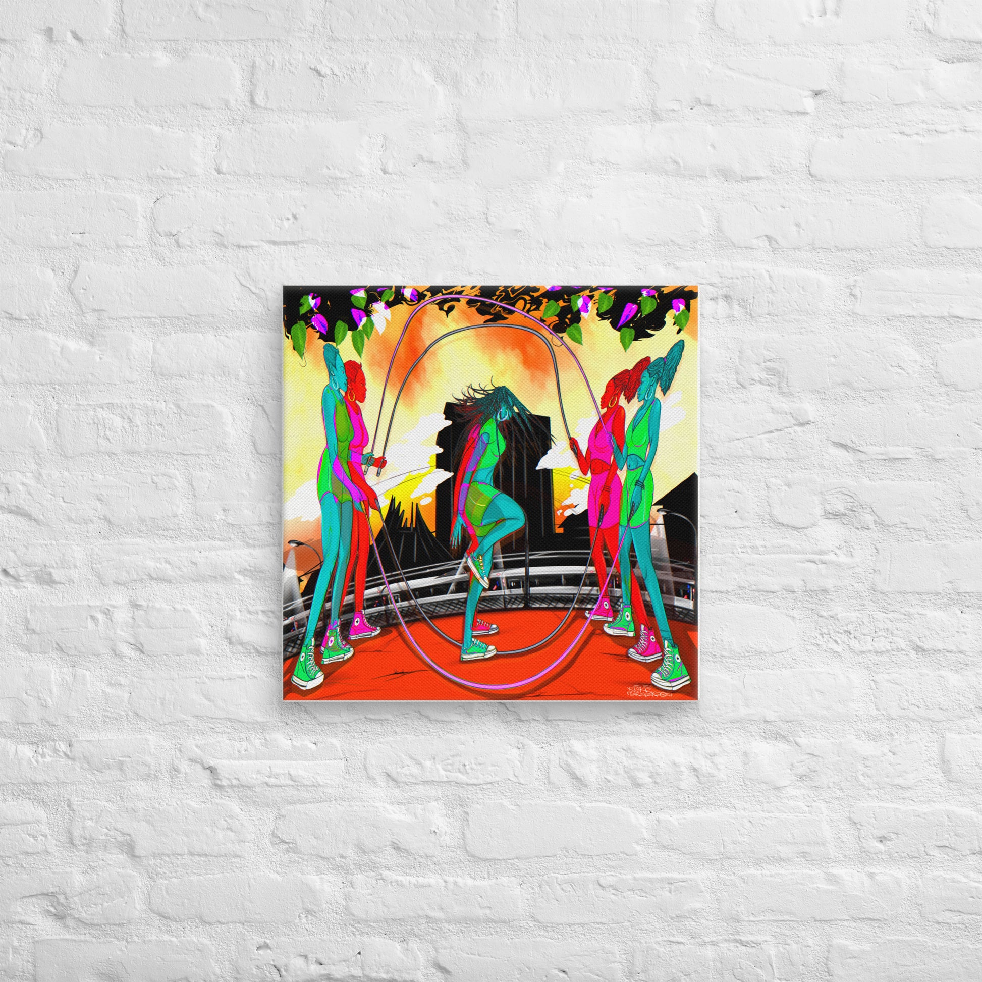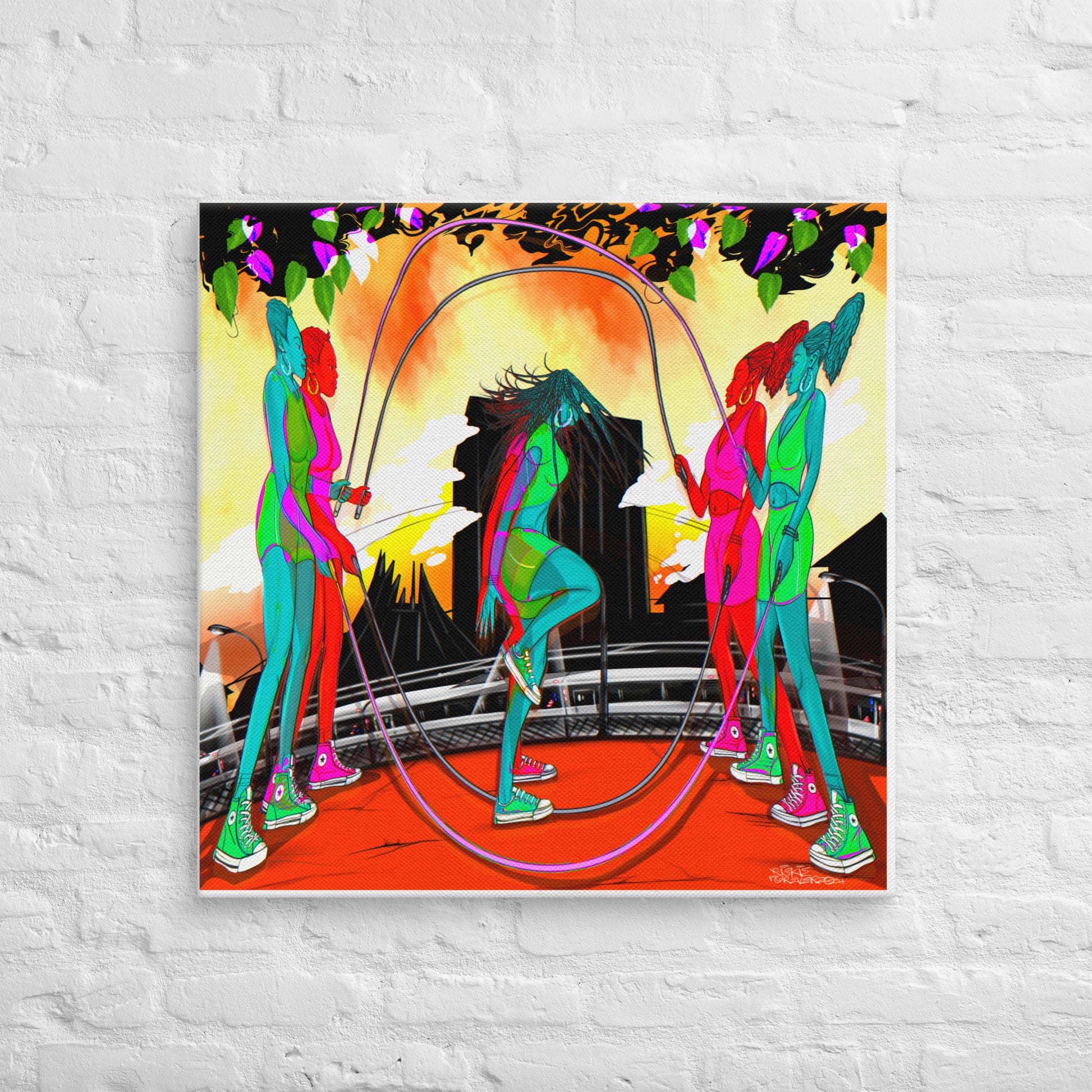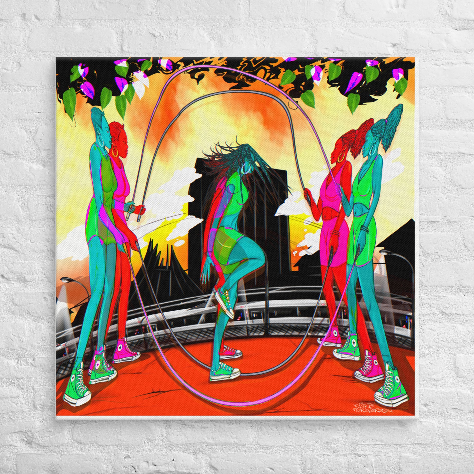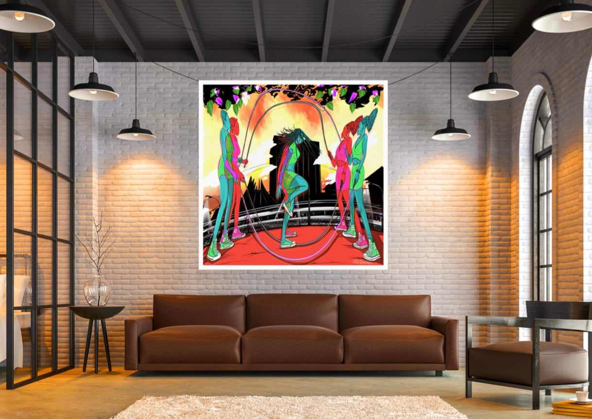 The vibrant colors and stylized figures in the painting are full of energy, reflecting the dynamic rhythm of the game. The four girls, painted in bold, neon hues, are engrossed in the act of jumping rope, their bodies fluid and in motion. Each girl wears colorful sneakers, adding to the playful and lively atmosphere of the scene. The jump ropes swing in synchronized arcs, framing the central figure who is in mid-jump, her braids flying in the air, embodying the focus and grace of the moment.
