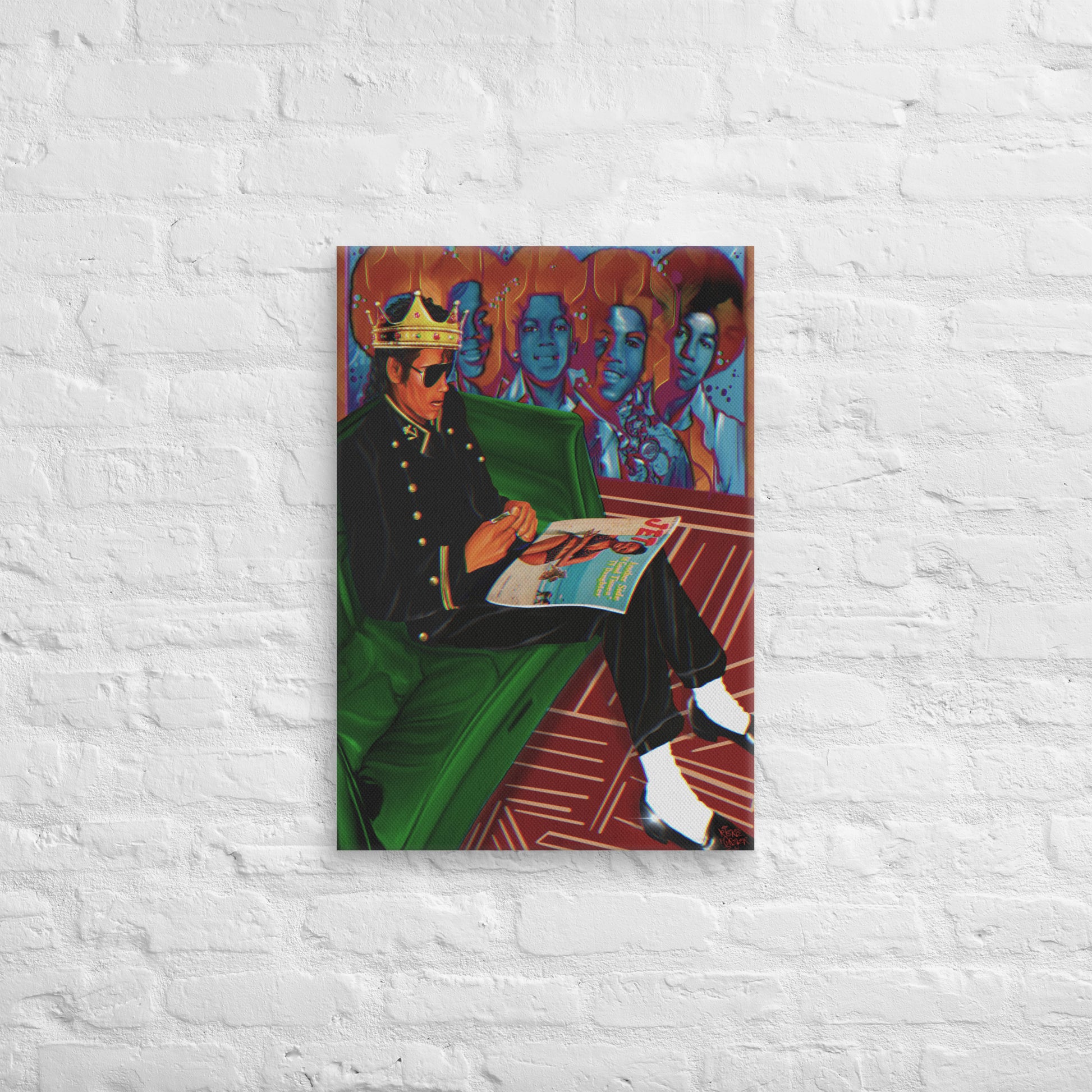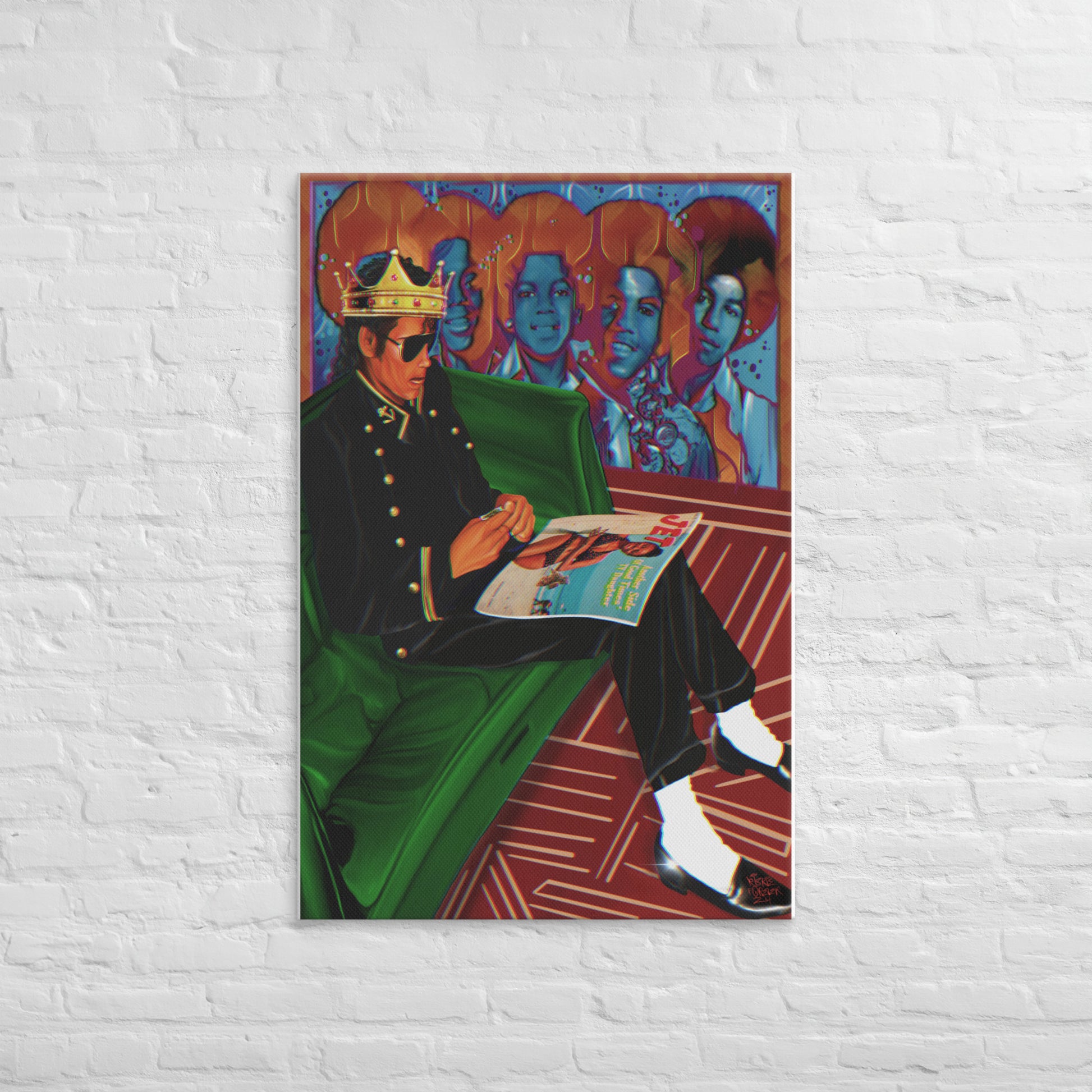 This painting, titled *King Mike* by Riskie Forever, features a dynamic portrayal of Michael Jackson seated on a green couch, wearing a regal crown and a black, military-style outfit with gold accents. He is absorbed in reading a vintage **JET** magazine, which features a woman on the cover. His iconic white socks and black loafers add to the unmistakable identity.
