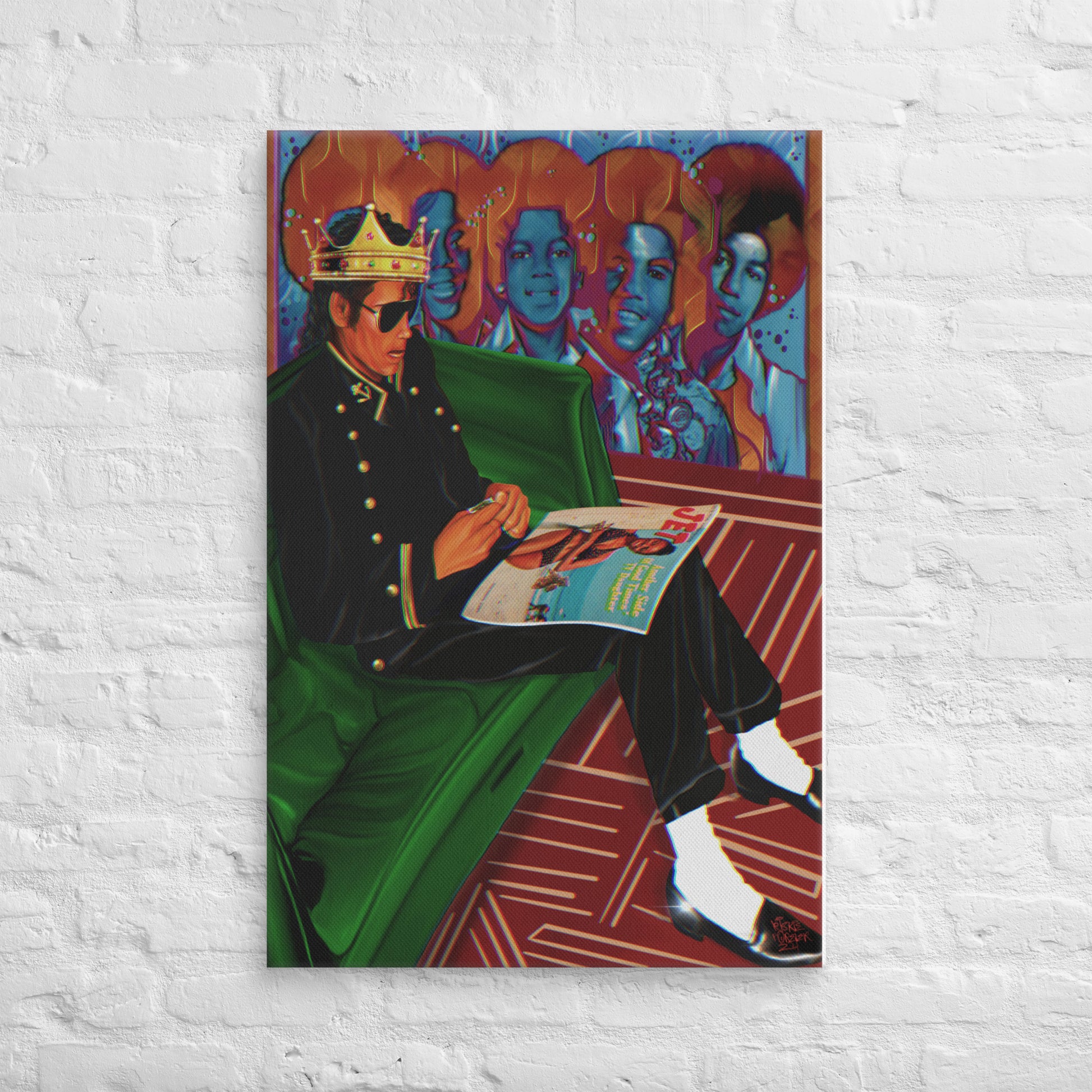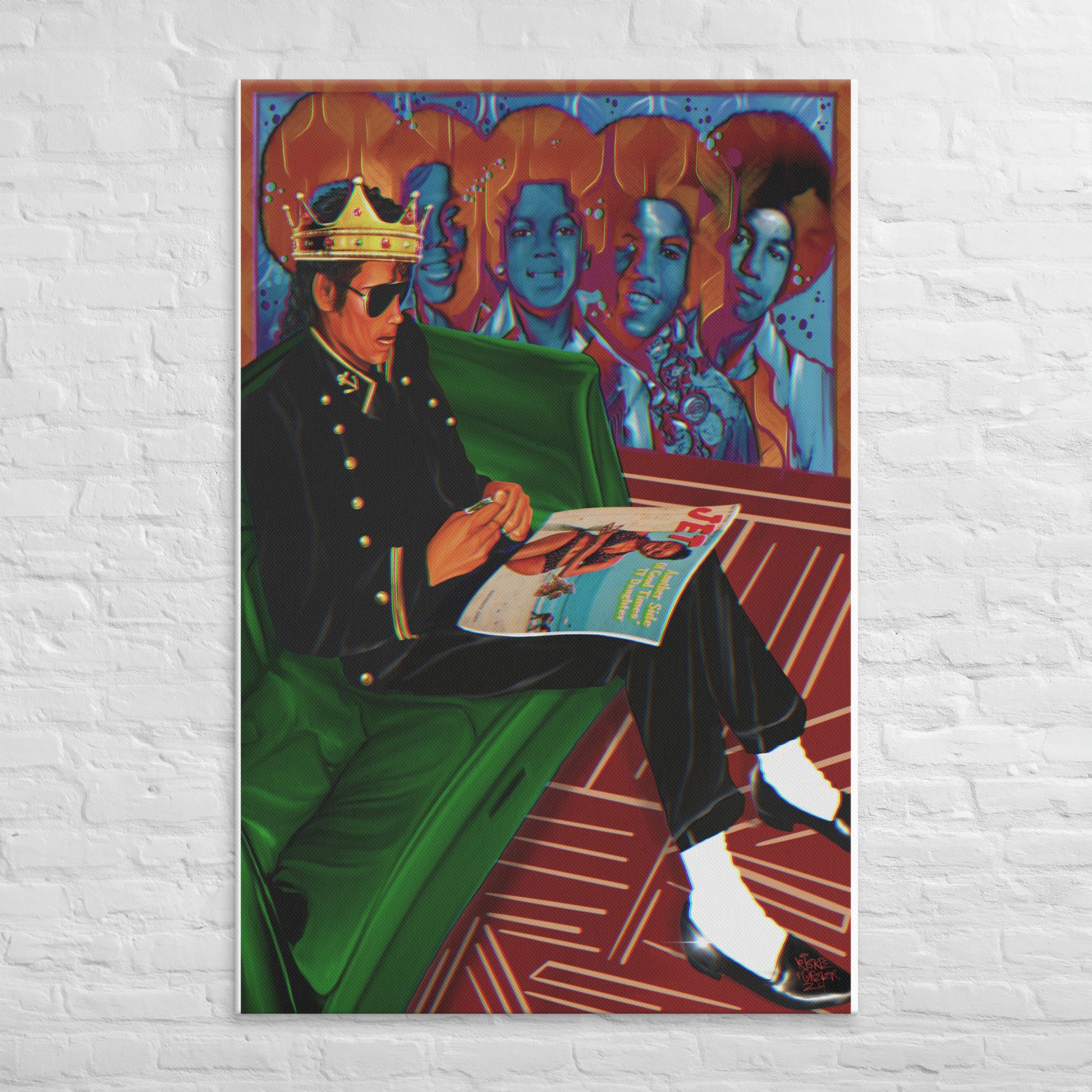 In the background, vibrant and bold colors depict The Jackson 5 in their youth, with their faces stylized in cool blues contrasted by warm oranges. This adds an energetic yet nostalgic feel to the composition. The color palette, combining rich greens, reds, oranges, and blues, creates a vivid atmosphere that highlights both the kingly presence of Michael Jackson and the group’s historical significance in music.