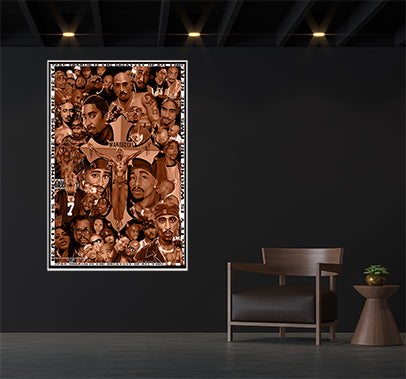 Rendered in a powerful sepia-toned palette, The GOAT encapsulates the multifaceted life and career of Tupac Shakur. The composition weaves together moments from his life, showcasing his roles as a poet, actor, activist, and revolutionary. At the centerpiece stands Tupac in a crucifixion pose, symbolizing his enduring legacy and martyr-like impact on the culture. Surrounding this central figure are detailed portraits of Tupac’s many faces—both literal and metaphorical—reflecting his dynamic personality and indomitable spirit.