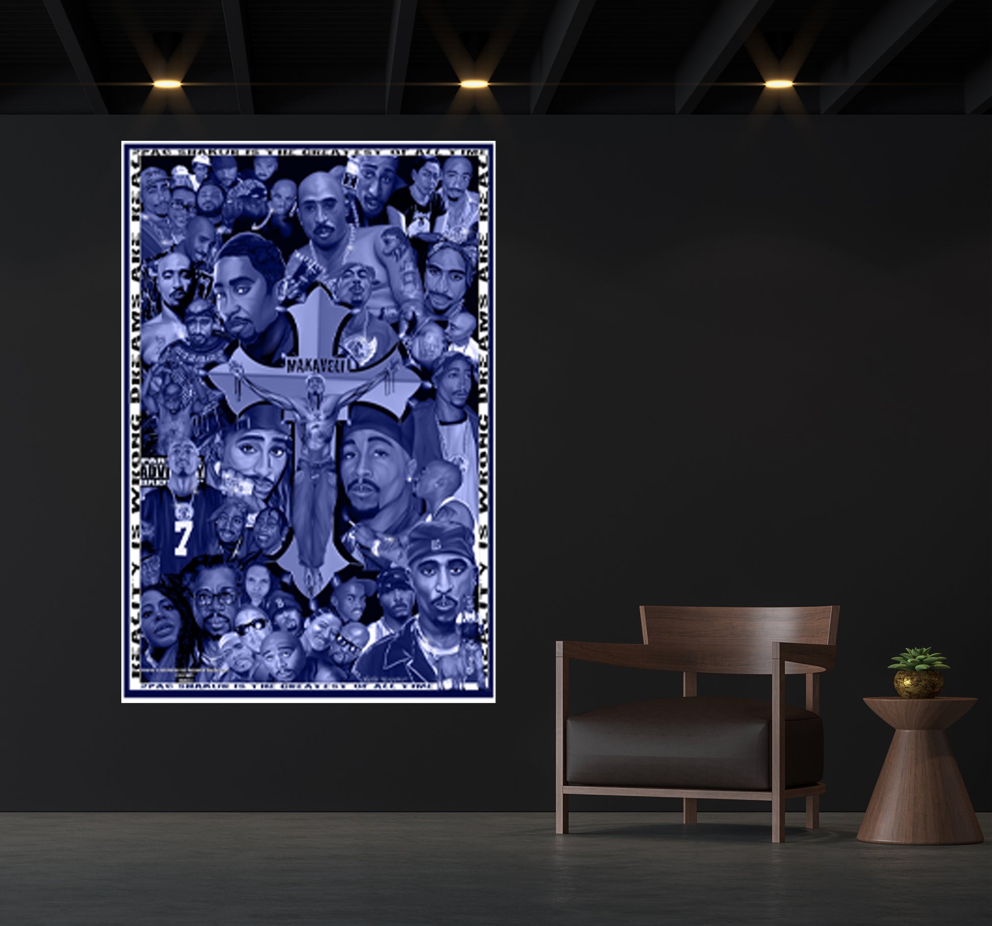 Rendered in a powerful monochromatic midnight palette, The GOAT encapsulates the multifaceted life and career of Tupac Shakur. The composition weaves together moments from his life, showcasing his roles as a poet, actor, activist, and revolutionary. At the centerpiece stands Tupac in a crucifixion pose, symbolizing his enduring legacy and martyr-like impact on the culture. Surrounding this central figure are detailed portraits of Tupac’s many faces—both literal and metaphorical—reflecting his dynamic personality and indomitable spirit.