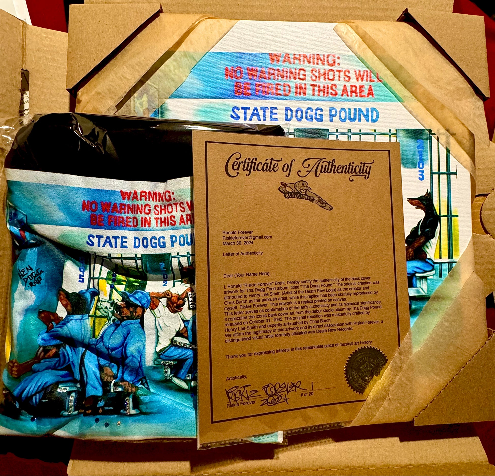 I'm excited to announce the release of a special collector’s box set featuring a meticulously repainted replica of the iconic Dogg Food album back cover art, originally created by artist Hen Dogg in 1995 and reimagined by Riskie Forever in 2024.